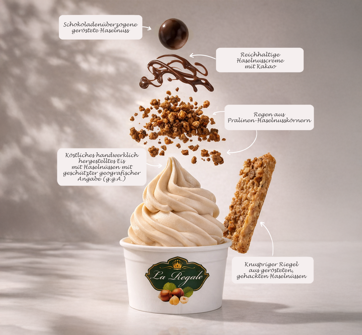 Machen Sie Ihre Desserts noch einzigartiger, indem Sie sie mit Pralinenkörnern, Nocciodrink und knusprigen Haselnüssen dekorieren.
